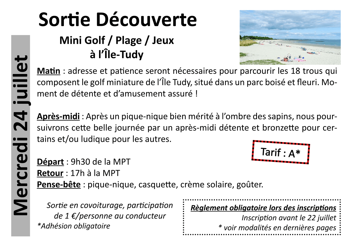 Mercredi 24 juillet Mini golf, jeux et plage à Ile Tudy ! Partager : Cliquer pour partager sur X(ouvre dans une nouvelle fenêtre) X Cliquez pour partager sur Facebook(ouvre dans une nouvelle fenêtre) Facebook J’aime chargement… Similaire Laisser un commentaire Annuler la réponse. Δ