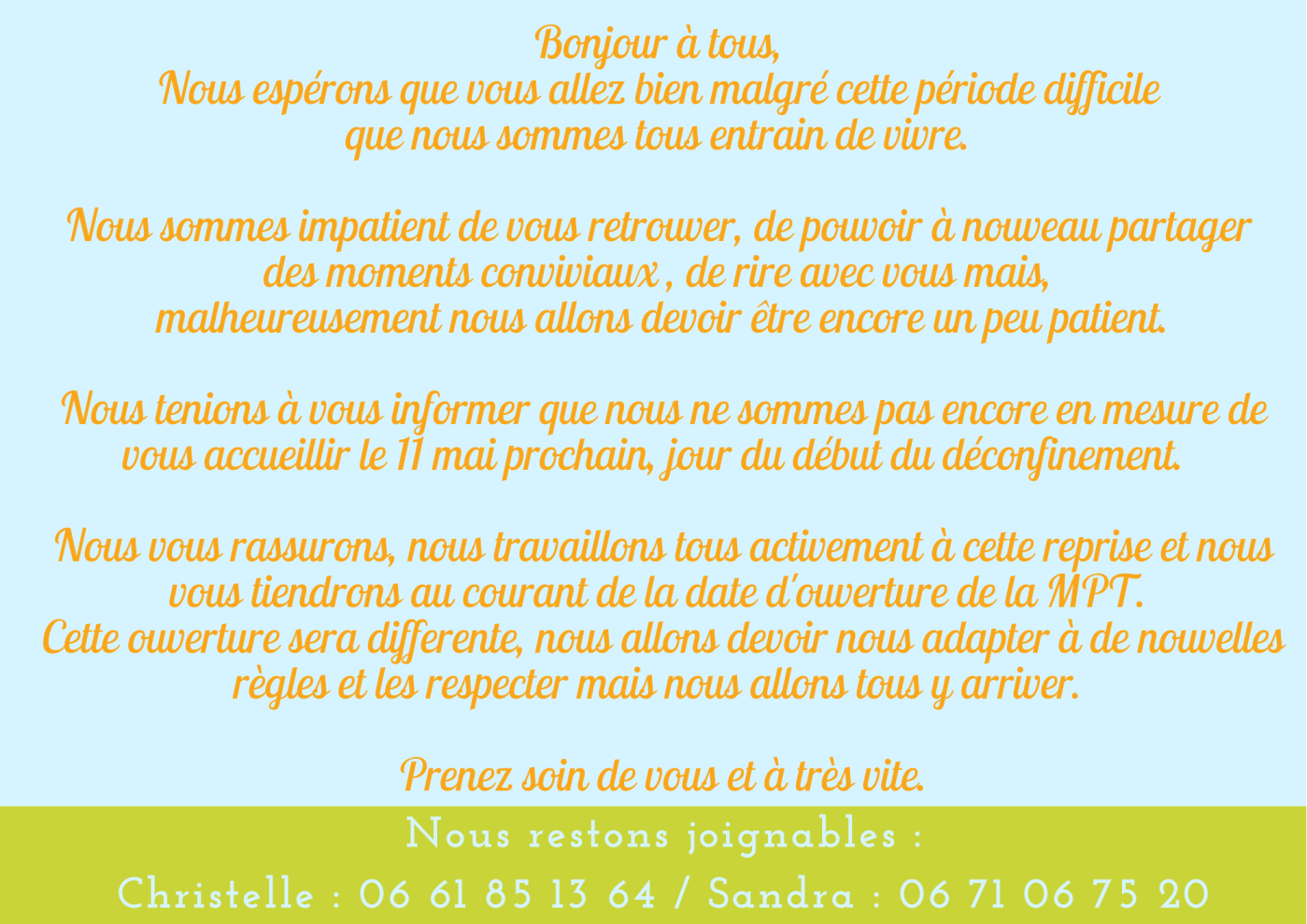 Nous tenions à vous informer que nous ne sommes pas encore en mesure de vous accueillir le 11 mai prochain, jour du début du déconfinement.