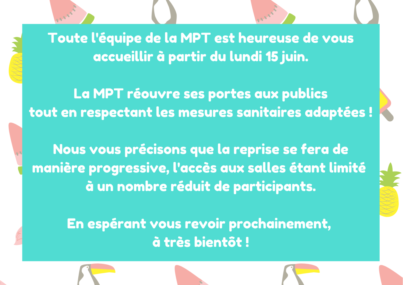 Toute l’équipe de la MPT est heureuse de vous accueillir à partir du lundi 15 juin.