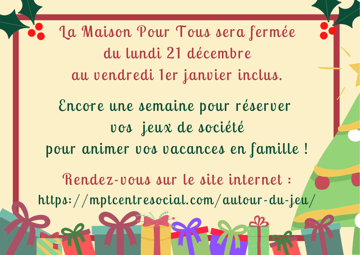La Maison Pour Tous sera fermée du lundi 21 décembre au vendredi 1er janvier inclus.