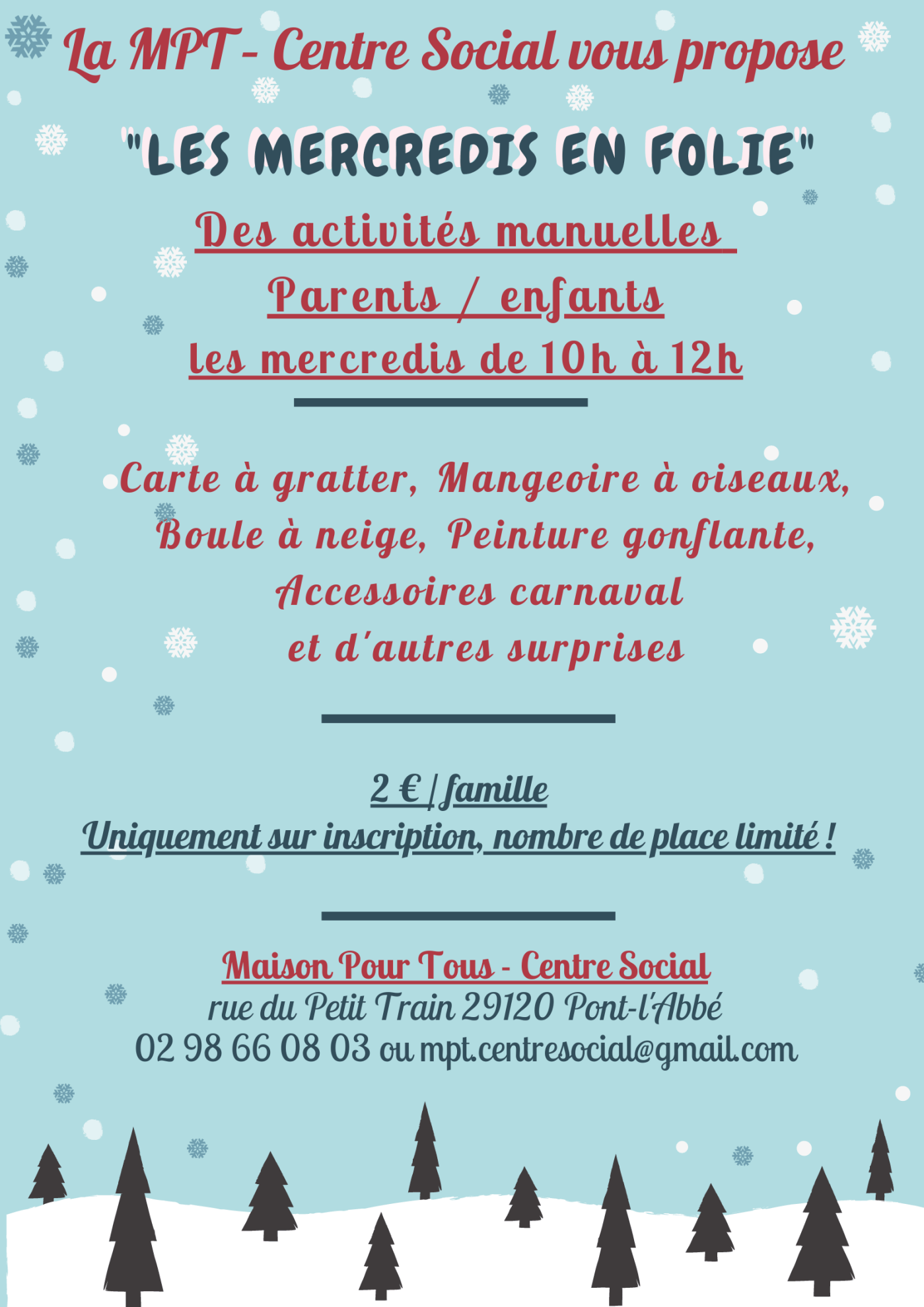 La MPT – Centre Social vous propose des activités manuelles Parents/Enfants les mercredis de 10h à 12h.