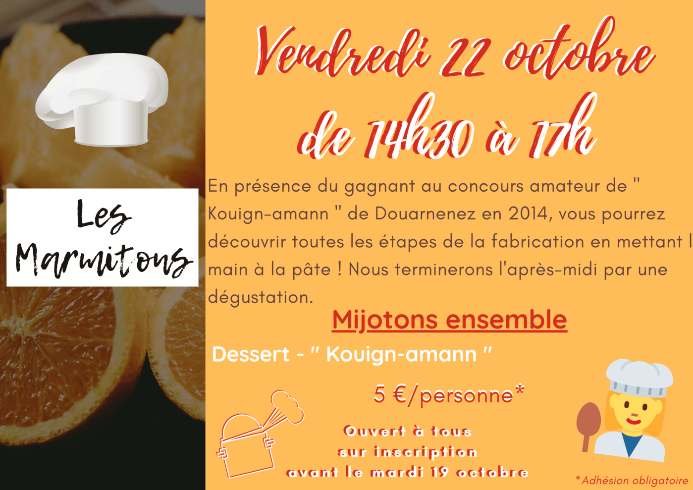 Infos Pratique : Vendredi 22 octobre de 14h30 à 17h à la Maison Pour Tous (rue du Petit Train à Pont-l’Abbé) – 5 €/personne (Adhésion obligatoire). Ouvert à tous sur inscription avant le mardi 19 octobre
