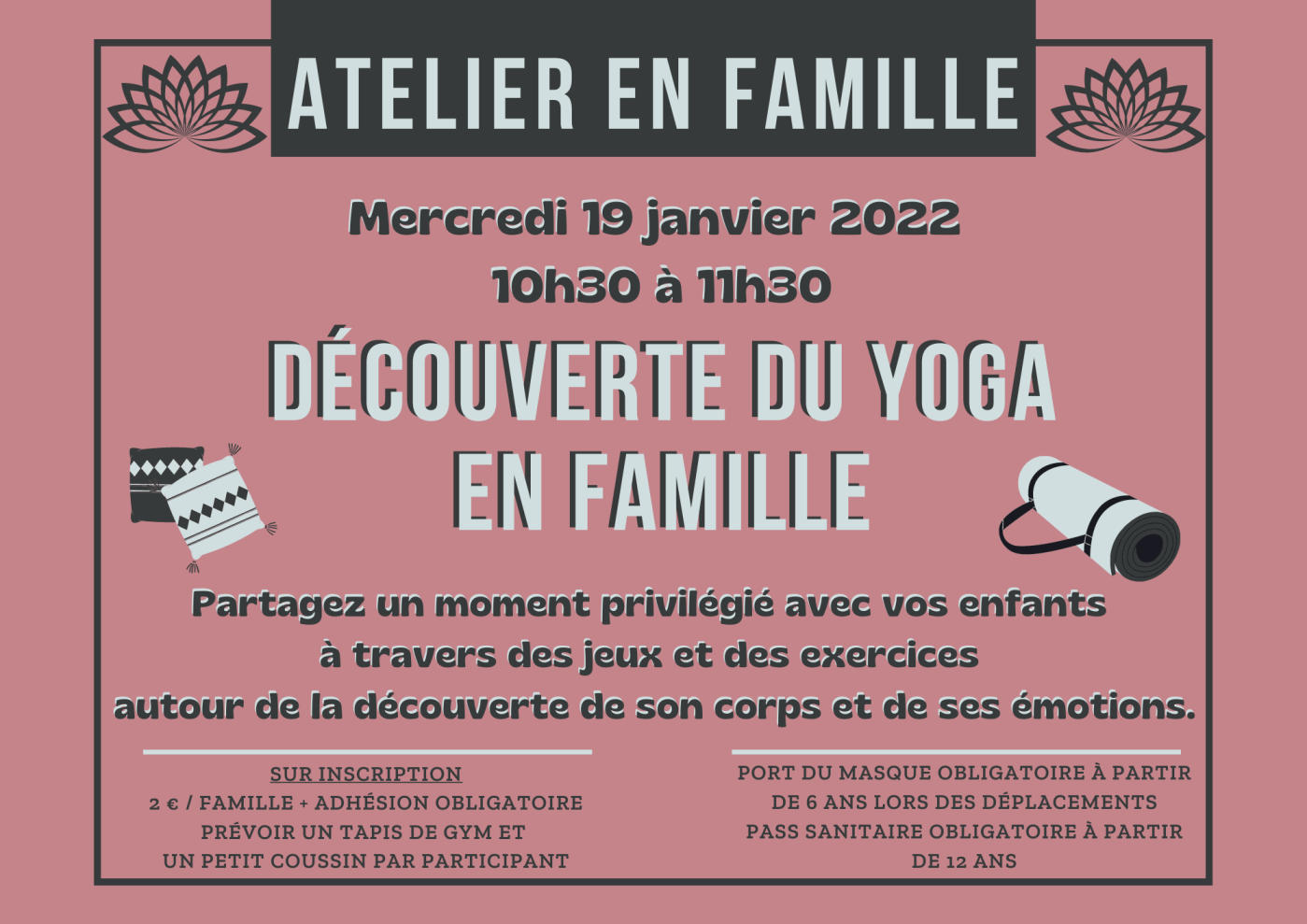 Infos Pratiques : 2€/famille + adhésion obligatoire. Prévoir un tapis de gym et un petit coussin par participant. Le port du masque obligatoire à partir de 6 ans lors des déplacements et le Pass sanitaire obligatoire à partir de 12 ans.