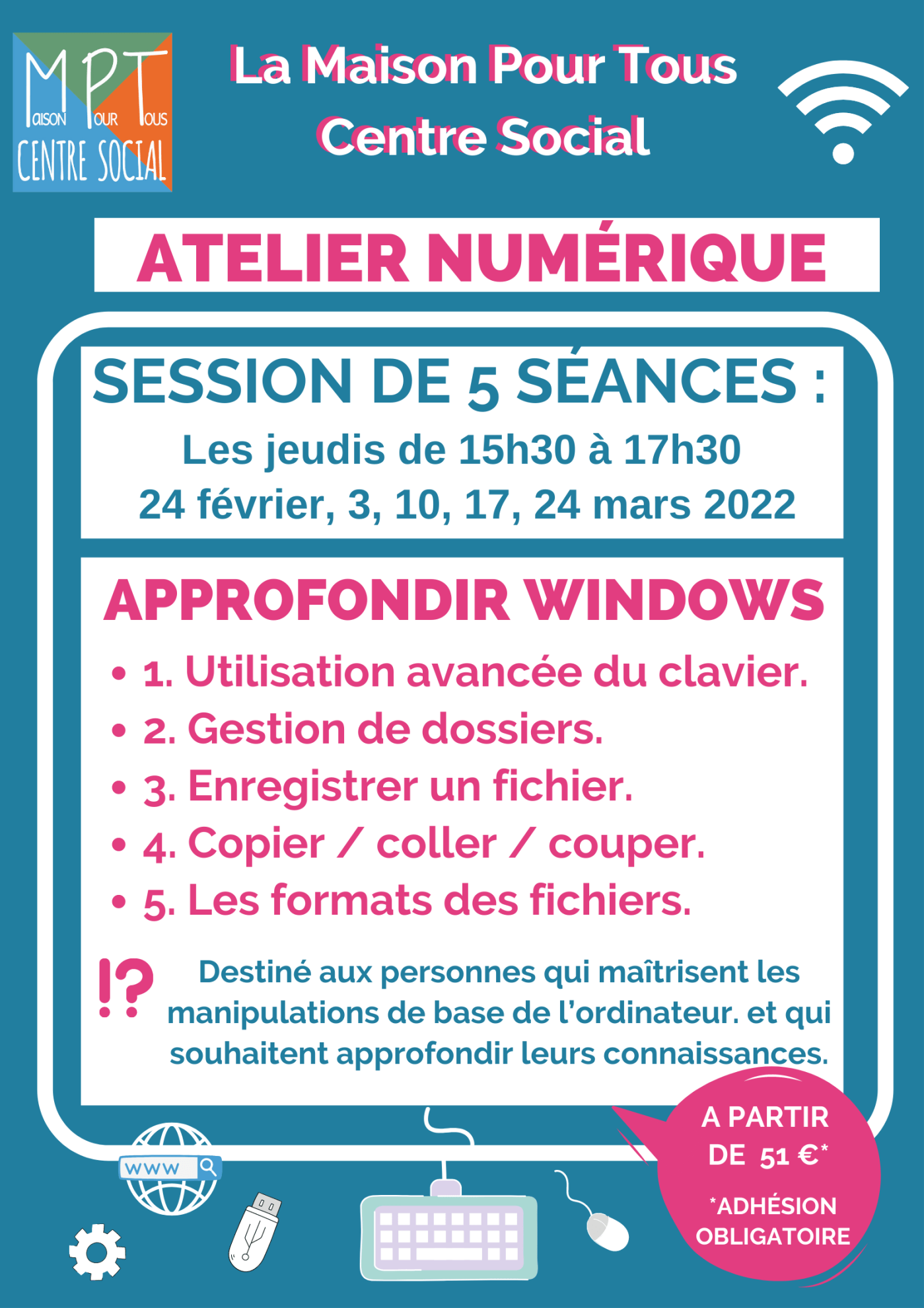 La Maison Pour Tous vous propose un atelier numérique « APPROFONDIR WINDOWS » se déroulant sur 5 séances de 2h.