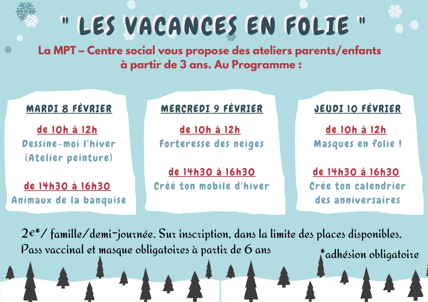 Info pratique : 2€/ famille et par atelier. Adhésion famille 17€. Uniquement sur inscription à l’accueil, par 02 98 66 08 03, au 06 71 06 75 20 ou par courriel mpt.centresocial@mptcentresocial.