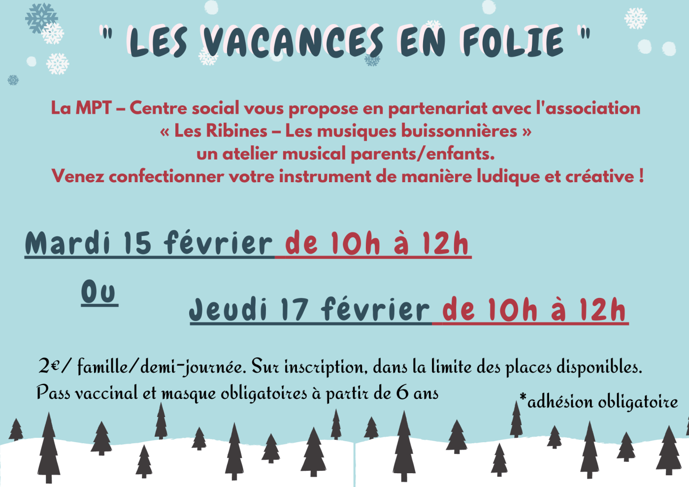 La MPT – Centre social vous propose en partenariat avec l’association « Les Ribines – Les musiques buissonnières » un atelier musical parents/enfants à partir de 3 ans.