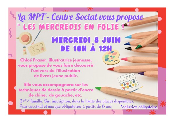 Atelier en famille Chloé Fraser, illustratrice jeunesse, vous propose de vous faire découvrir l'univers de l'illustration de livre jeune public. Elle vous accompagnera sur les techniques de dessin à partir d'encre de chine, de gouache, etc. Infos Pratiques : 2€/famille + adhésion obligatoire.
