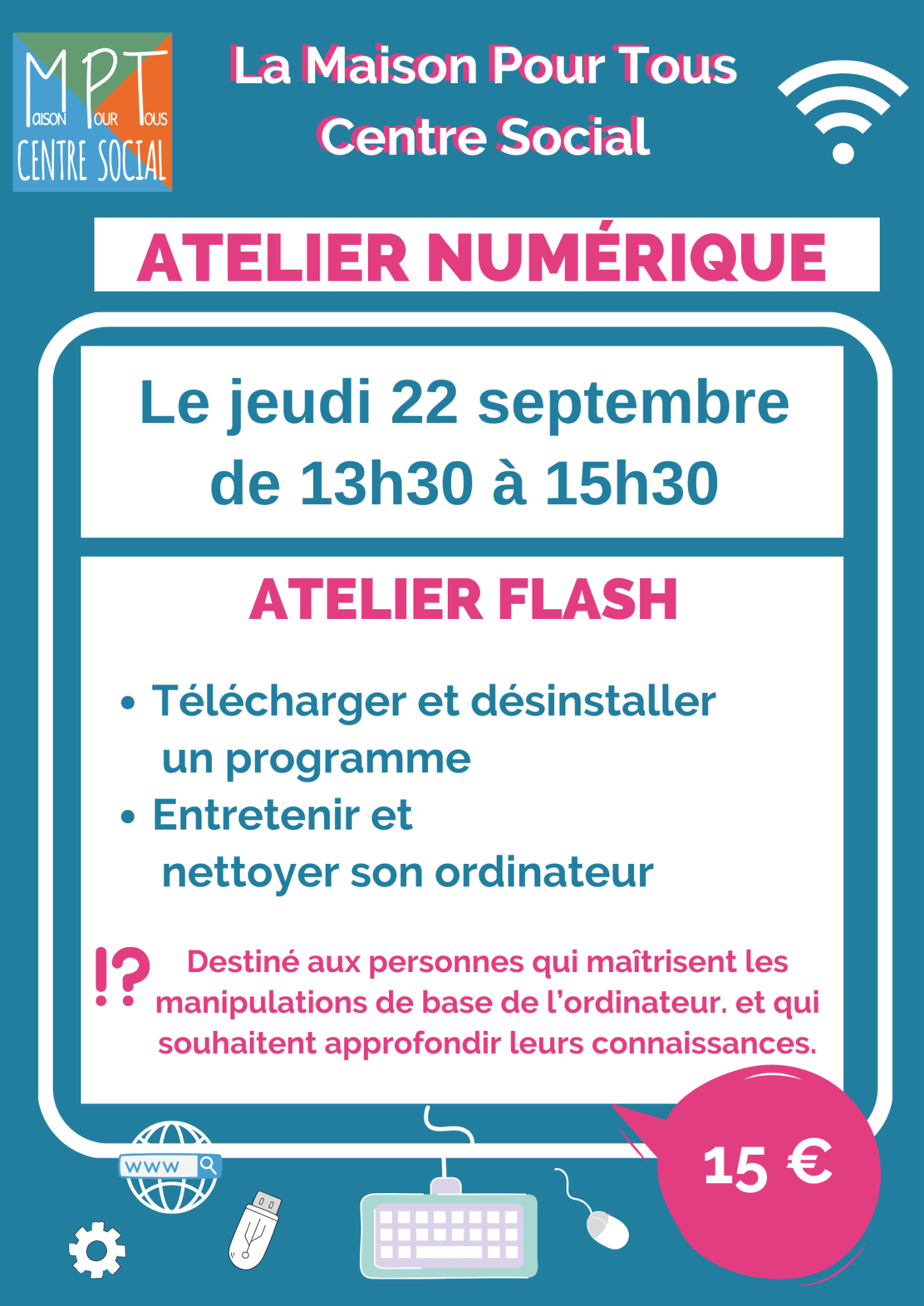 Les ateliers flash sont des ateliers thématiques d’une heure et demie à deux heures portant sur l’utilisation d’un logiciel ou l’apprentissage d’une technique.Cette semaine la MPT propose le thème : « Télécharger et installer/désinstaller un programme et entretenir et nettoyer son ordinateur ».