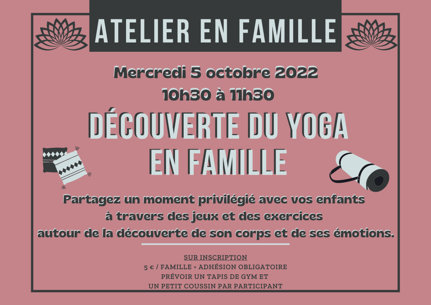 Venez découvrir un atelier « Yoga en famille » mercredi 5 octobre de 10h30 à 11h30 à la MPT-Centre Social animé par Chrystelle GOURDIS (AIME Sophrologie & Yoga). Partagez un moment privilégié avec vos enfants à travers des jeux et des exercices autour de la découverte de son corps et de ses émotions.