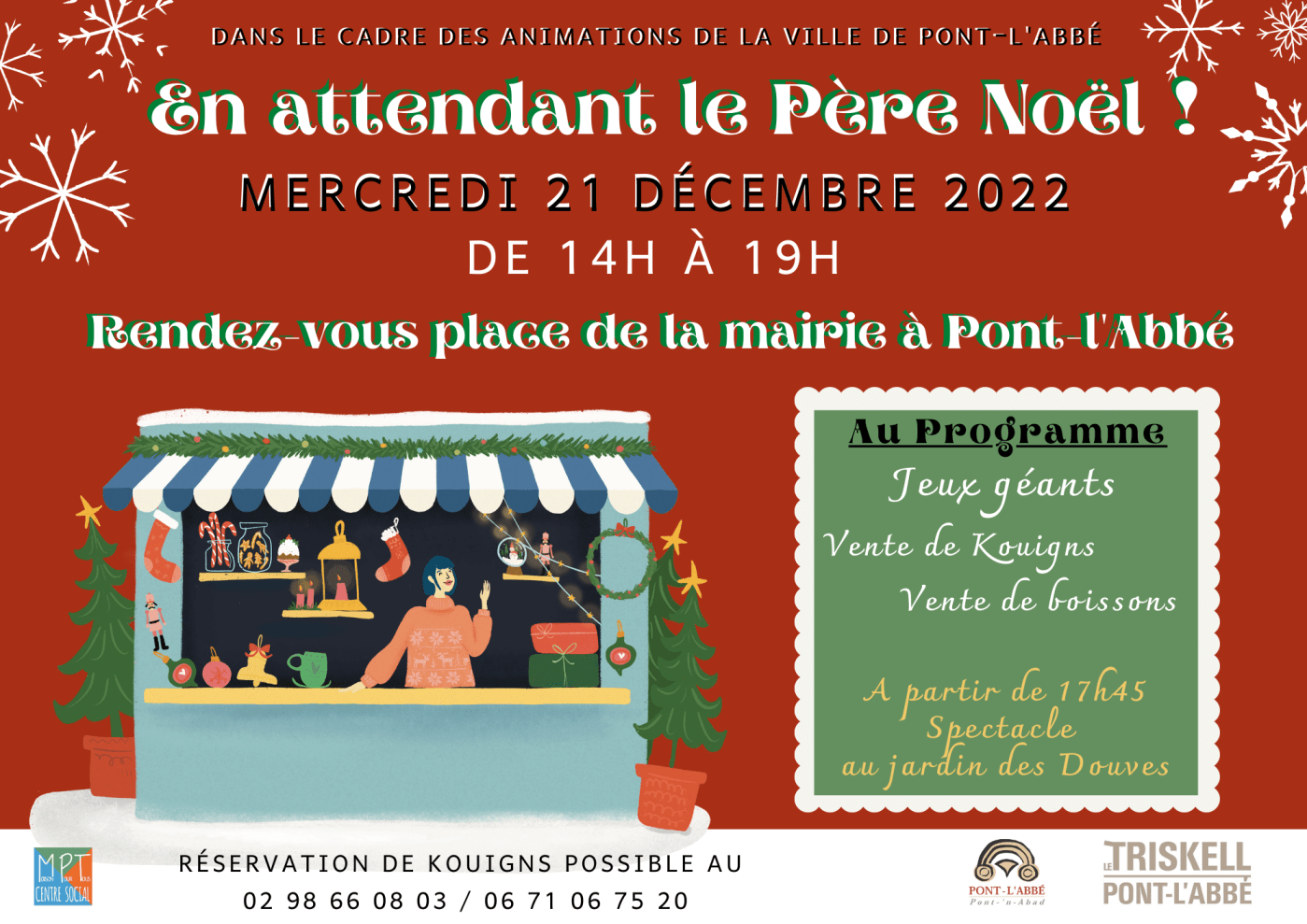 L’équipe de la MPT – Centre social vous propose de la rejoindre sur la place de la mairie de 14h à 19h30 à Pont-l’Abbé pour partagé un après midi autour de jeux surdimensionnés et de petites douceurs (chocolat chaud, vin chaud, kouigns).