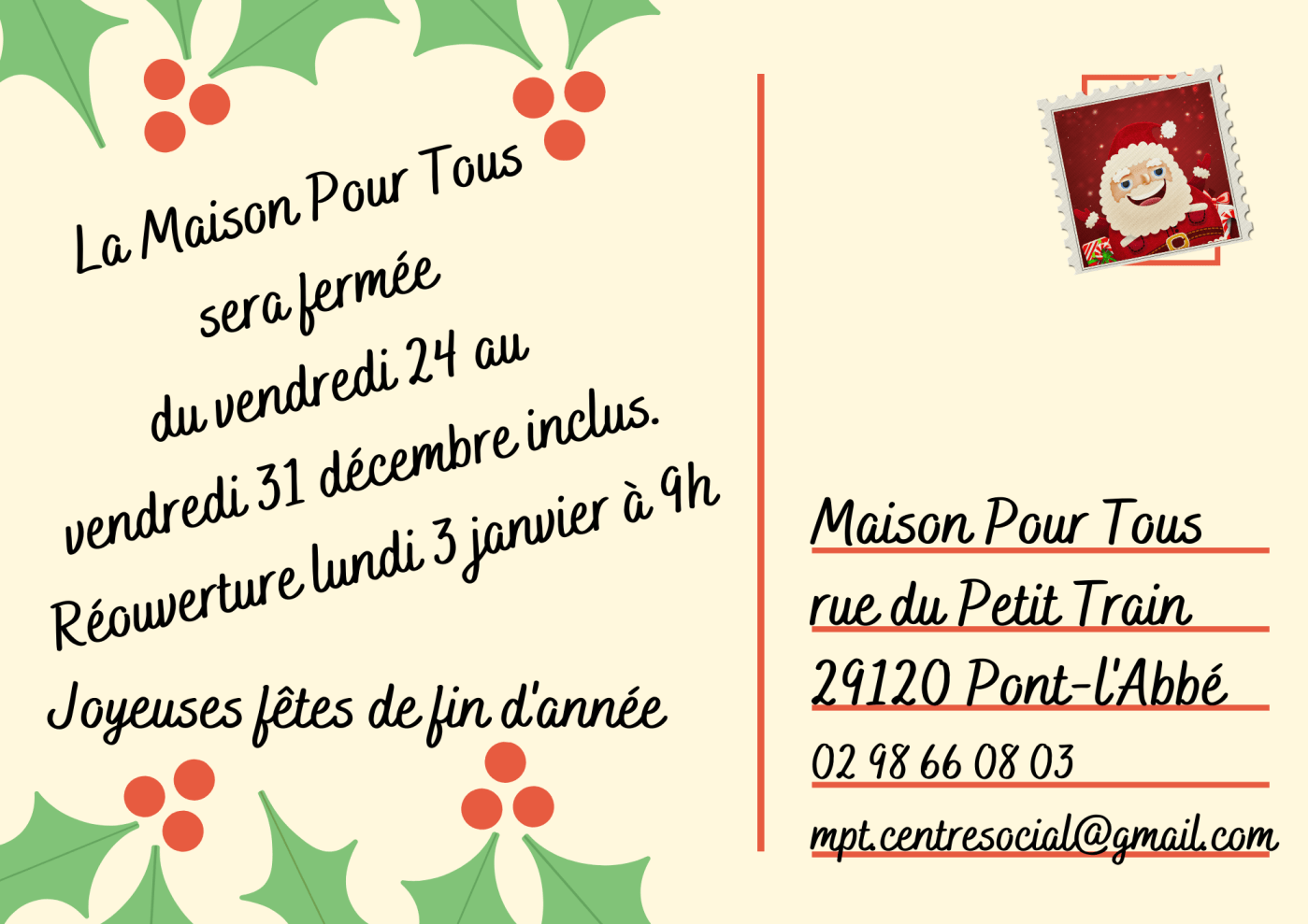 La Maison Pour Tous Centre Social sera fermée du vendredi 23 au lundi 2 janvier inclus.