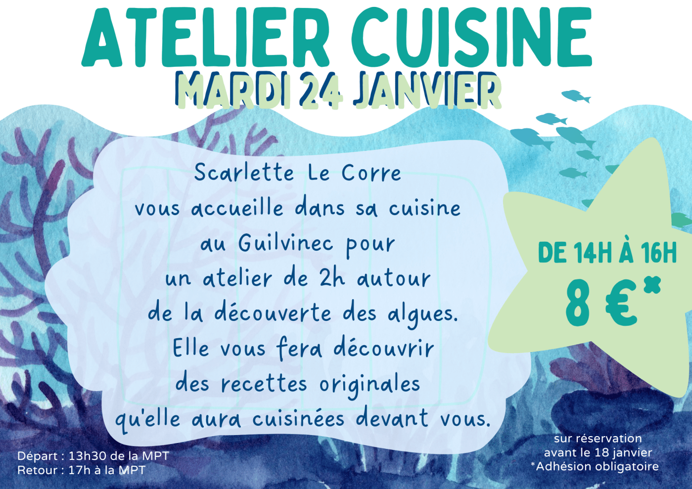 Scarlette Le Corre vous accueille dans sa cuisine au Guilvinec pour un atelier de 2h autour de la découverte des algues. Elle vous fera découvrir des recettes originales qu’elle aura cuisinées devant vous.