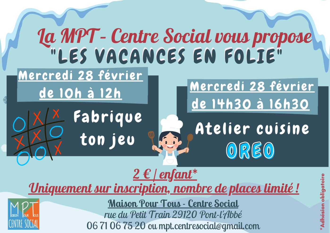 Mardi 28 février, l’aventure des vacances en folie ! se poursuit : la matin venez créer votre jeu de société tel que le morpion (plusieurs modèles vous serons proposés). L’après midi venez pâtisser des « OREO » maison, une recette simple à faire et refaire découvrir à vos famille et amis !