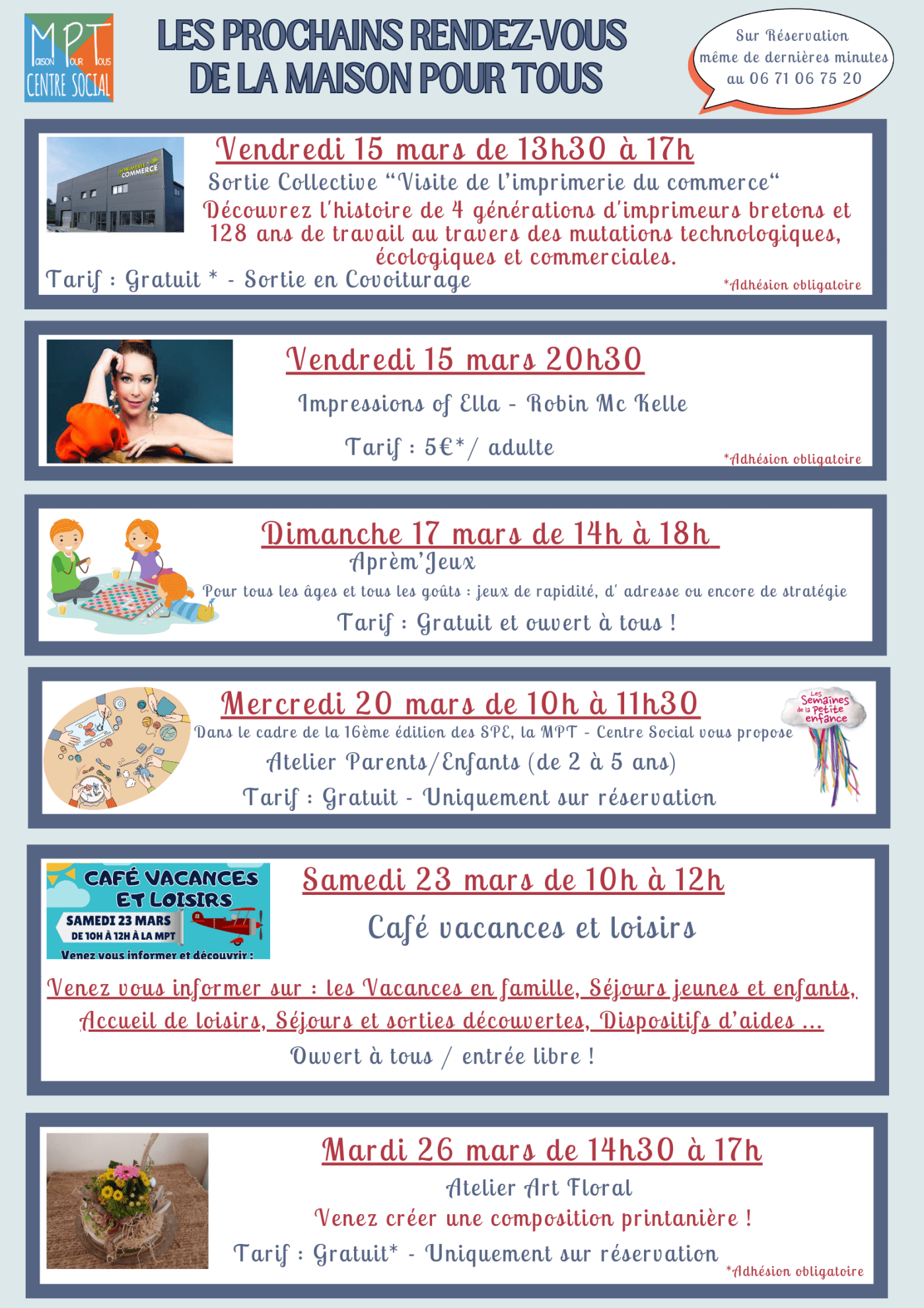 Les rendez-vous du mois de mars Animations et ateliers sur inscription même de dernière minute au 06 71 06 75 20 ! Partager : Cliquer pour partager sur X(ouvre dans une nouvelle fenêtre) X Cliquez pour partager sur Facebook(ouvre dans une nouvelle fenêtre) Facebook J’aime chargement… Similaire Laisser un commentaire Annuler la réponse. Δ