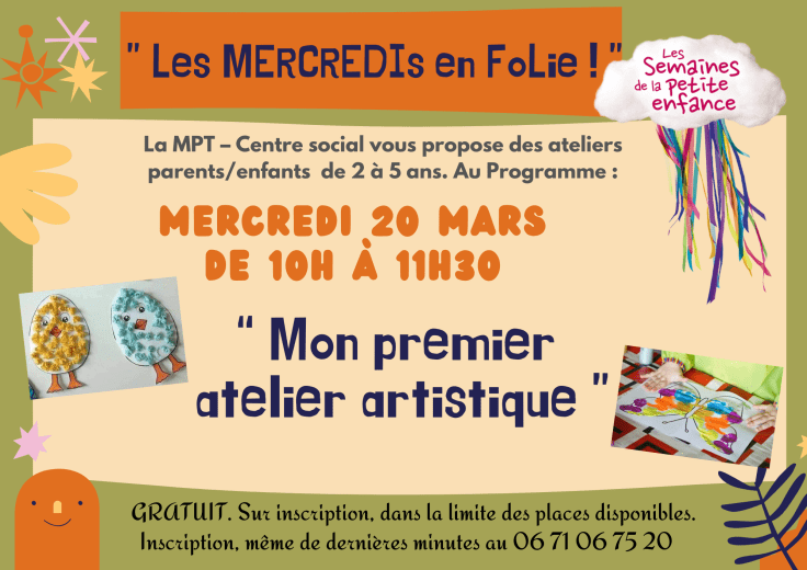 Les semaines de la petite enfance (du 1er mars au 20 avril 2024), sont l’occasion de rencontrer, d’échanger, de découvrir, de se laisser surprendre et enchanter par des ateliers, des spectacles, des animations, etc. le programme complet sera disponible à l’accueil de la MPT.