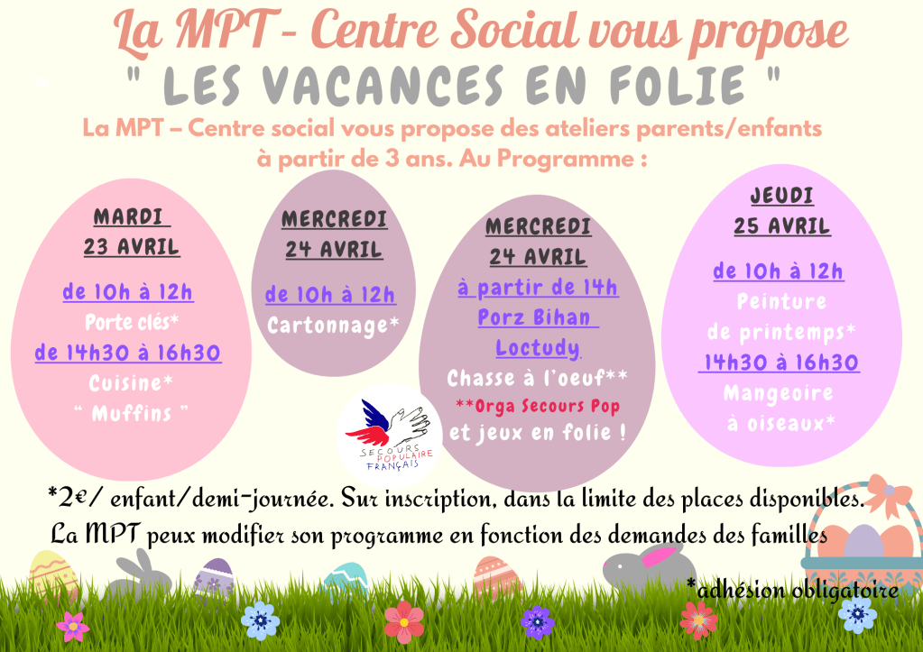A chaque période de vacances scolaires, la MPT – Centre social vous propose 3 journées consécutives d’animation pour petits et grands. Au programme, un espace de jeux adapté à chaque âge (jeux de construction, d’imitation, de société, coin bébé) et des animations thématiques (bricolage, activité manuelle, cuisine).