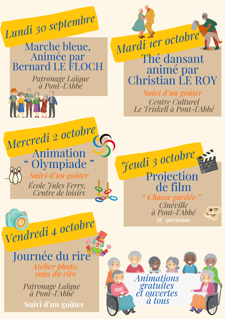 Dans le cadre de la Semaine Nationale des retraités et personnes âgées, le CCAS de Pont-l’Abbé organise une semaine dédiée à nos aînés, en partenariat avec le CCAS de Combrit, la Maison Pour Tous – Centre Social, le Lycée Laënnec, le CLIC du Pays Bigouden, l’Hôtel Dieu de Pont-l’Abbé, Ty Pors Moro, la résidence séniors de « Ty Kerentrée »