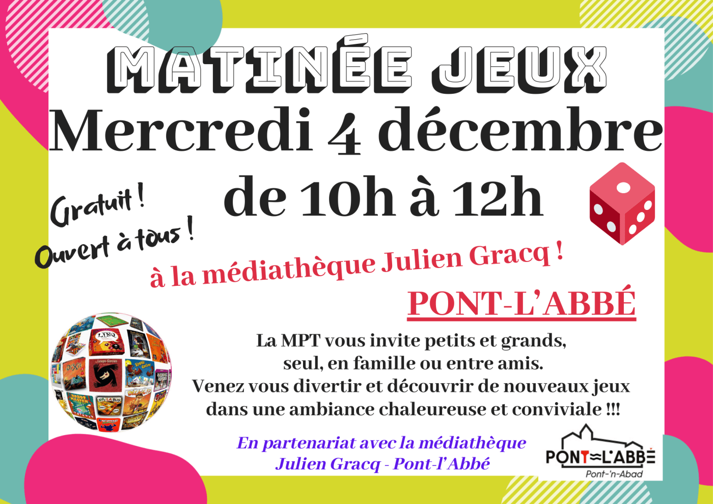 La MPT vous invite pour un moment ludique de 10h à 12h à la médiathèque Julien Gracq de Pont-l’Abbé. Petits et grands, seul, en famille ou entre amis, venez vous divertir et découvrir de nouveaux jeux dans une ambiance chaleureuse et conviviale !!! Info pratique : Gratuit et ouvert à tous !