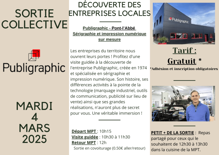 Les entreprises du territoire nous ouvrent leurs portes ! Profitez d’une visite guidée à la découverte de l’entreprise Publigraphic, créée en 1974 et spécialisée en sérigraphie et impression numérique. Son histoire, ses différences activités à la pointe de la technologie (marquage industriel, outils de communication, publicité sur lieu de vente) ainsi que ses grandes réalisations, n’auront plus de secret pour vous. Une véritable immersion !