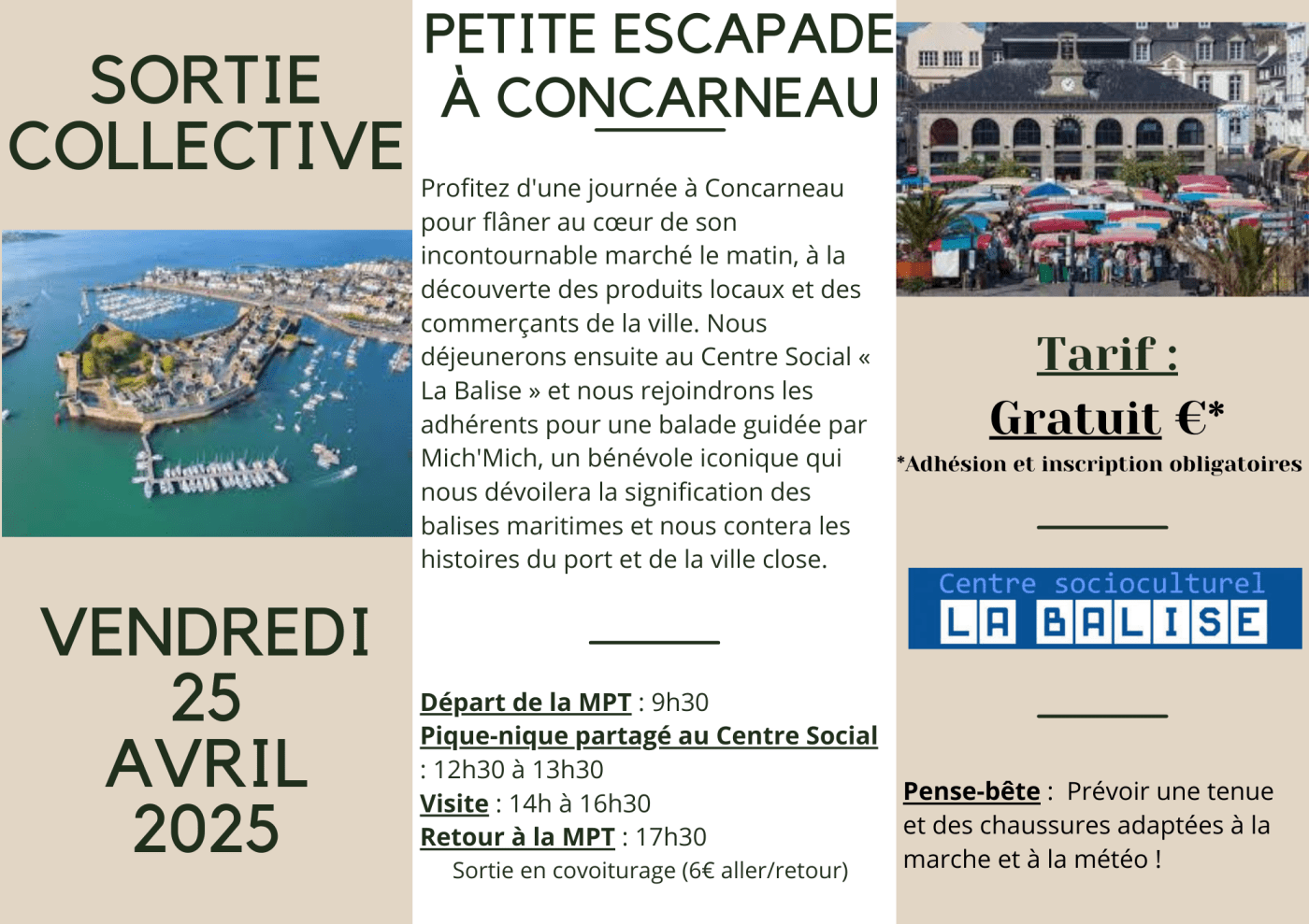 Profitez d’une journée à Concarneau pour flâner au cœur de son incontournable marché le matin, à la découverte des produits locaux et des commerçants de la ville. Nous déjeunerons ensuite au Centre Social « La Balise » et nous rejoindrons les adhérents pour une balade guidée par Mich’Mich, un bénévole iconique qui nous dévoilera la signification des balises maritimes et nous contera les histoires du port et de la ville close.