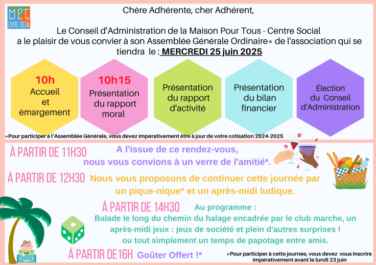 Le Conseil d’Administration de la Maison Pour Tous – Centre Social a le plaisir de vous convier à l’Assemblée Générale Ordinaire de l’association qui se tiendra le :