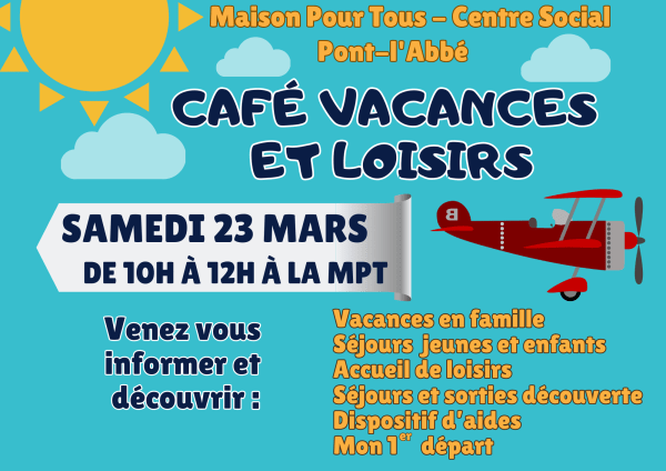 Café vacances et loisirs Samedi 23 mars de 10 à 12h dans la grande salle de la Maison Pour Tous- Centre Social - Rue du Petit Train à Pont-l'Abbé. L'objectif est de faire connaître un maximum de dispositifs aux familles et aux professionnels ; lever les freins aux projets de départ en vacances ; oser... Lire la Suite →