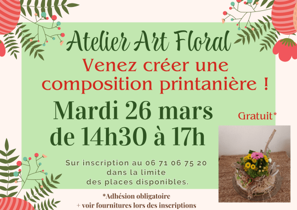 Atelier Art Floral : Venez créer une composition printanière ! Paule vous propose de vous accompagner dans la création d'une composition printanière ! Gratuit sur inscription au 06 71 06 75 20 ou par email : mpt.centresocial@gmail.com Liste des fournitures à apporter : 1 grande assiette plate et ronde2 ou 3 branches sans feuillesDu feuillage... Lire la Suite →
