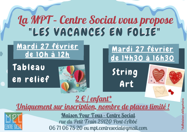 Mardi 27 février, premier jour des vacances en folie ! Le matin venait confectionner un tableau en relief (différents thèmes vous seront proposés). L'après midi venez découvrir le string art (Le string art consiste à tendre des ficelles de couleurs entre les clous, qui ont été préalablement bien positionnés, à l'aide d'un gabarit.) (différents modèles... Lire la Suite →
