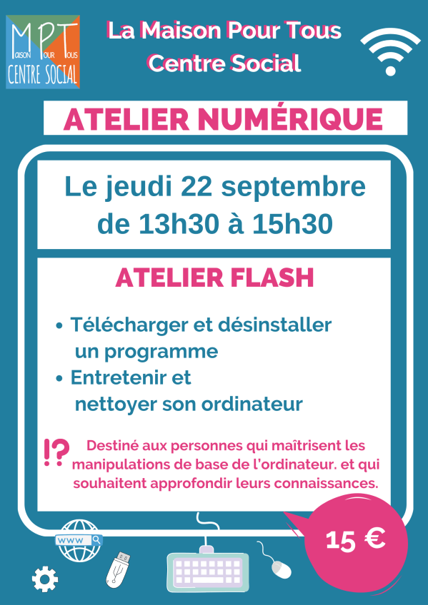 Atelier numérique Les ateliers flash sont des ateliers thématiques d’une heure et demie à deux heures portant sur l’utilisation d’un logiciel ou l’apprentissage d’une technique.Cette semaine la MPT propose le thème : « Télécharger et installer/désinstaller un programme et entretenir et nettoyer son ordinateur ». Infos Pratiques : Jour : Jeudi 22 septembre 2022 Horaire... Lire la Suite →