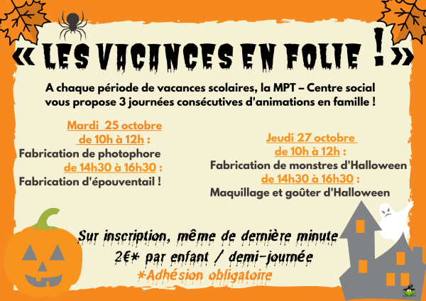 A chaque période de vacances scolaires, la MPT – Centre social vous propose 3 journées consécutives d'animation pour petits et grands. Au programme, un espace de jeux adapté à chaque âge (jeux de construction, d'imitation, de société, coin bébé) et des animations thématiques (bricolage, activité manuelle, cuisine). « Les vacances en folie ! même pas... Lire la Suite →