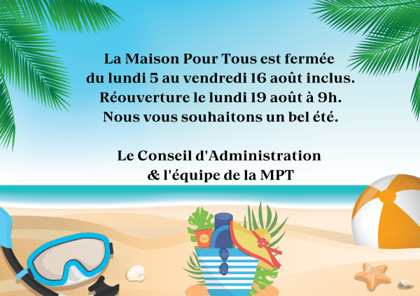 La Maison Pour Tous est fermée du lundi 5 août au mercredi 16 août inclus. Réouverture le lundi 19 août à 9h. Nous vous souhaitons un bel été. Le Conseil d'Administration & l'équipe de la MPT