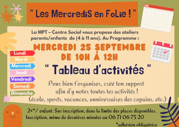 Atelier en famille La MPT – Centre social vous propose des ateliers parents/enfants à partir (de 4 ans à 11 ans). "Tableau d'activité" Pour bien t’organiser, créé ton support afin d’y noter toutes tes activités ! (école, sports, vacances, anniversaires des copains, etc.) Infos Pratiques : Atelier sur inscription même de dernière minute au 06... Lire la Suite →
