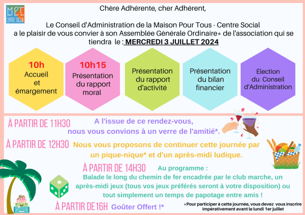 Le Conseil d'Administration de la Maison Pour Tous - Centre Social a le plaisir de vous convier à l'Assemblée Générale Ordinaire de l'association qui se tiendra le : Mercredi 25 juin à partir de 10h dans la grande salle de la MPT L'Assemblée Générale se déroulera comme suit : 10h : Accueil et émargement 10h15... Lire la Suite →