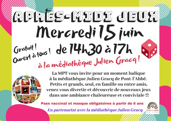 La MPT vous invite pour un moment ludique de 14h30 à 17h à la médiathèque Julien Gracq de Pont-l'Abbé. Petits et grands, seul, en famille ou entre amis, venez vous divertir et découvrir de nouveaux jeux dans une ambiance chaleureuse et conviviale !!! Info pratique : Gratuit et ouvert à tous.