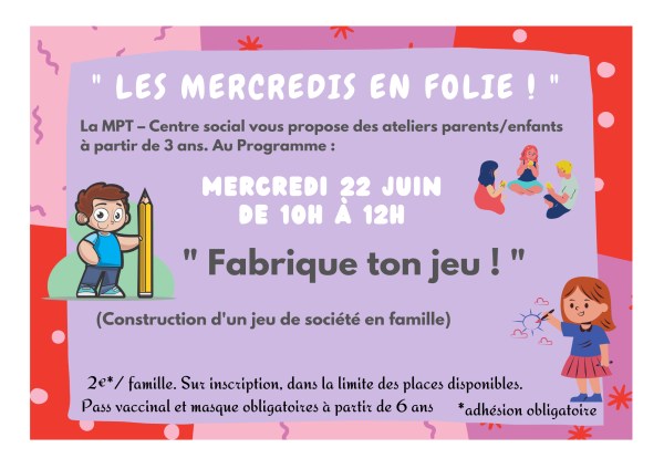 Atelier en famille La MPT – Centre social vous propose un atelier parents/enfants pour petits et grands à partir de 3 ans. Au Programme : « Fabrique ton jeu ! » (Construction d'un jeu de société en famille) Infos Pratiques : 2€/famille + adhésion obligatoire.