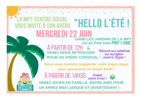 Hello l'été ! La MPT vous invite à nous rejoindre pour un moment festif et amical " Hello l'été ! " à la Maison Pour Tous. Au programme : à partir de 11h45 : apéro convivial12H30 : pique-nique partagés14h30 : Après-midi jeux Infos Pratiques : Gratuit et ouvert à tous !
