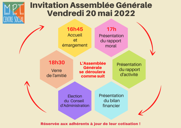 Chère Adhérente, cher Adhérent, Le Conseil d'Administration de la Maison Pour Tous - Centre Social a le plaisir de vous convier à son Assemblée Générale Ordinaire qui se tiendra le Vendredi 20 mai 2022 à partir de 16h45 dans la grande salle de la MPT