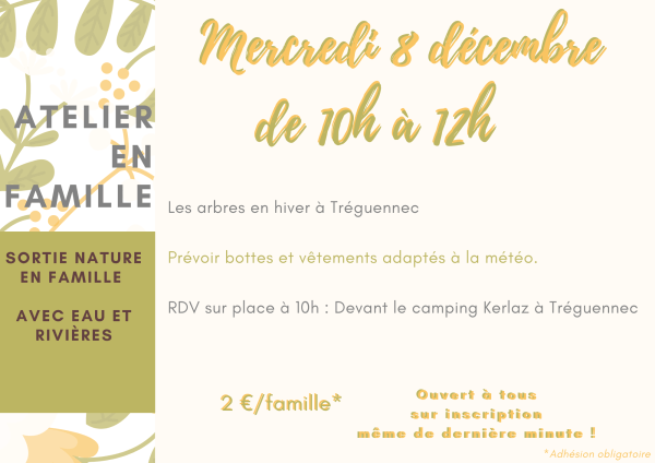 Sortie en famille ! La Maison Pour Tous en partenariat avec l’association « Eau et Rivières » vous propose une matinée ludique à Treguennec. Infos Pratique : Mercredi 8 décembre de 10h à 12h. RDV sur place à 10h devant le camping Kerlaz à Treguennec. Prévoyez une tenue adaptée (bottes, k-way, tenue de rechange, serviette au cas... Lire la Suite →