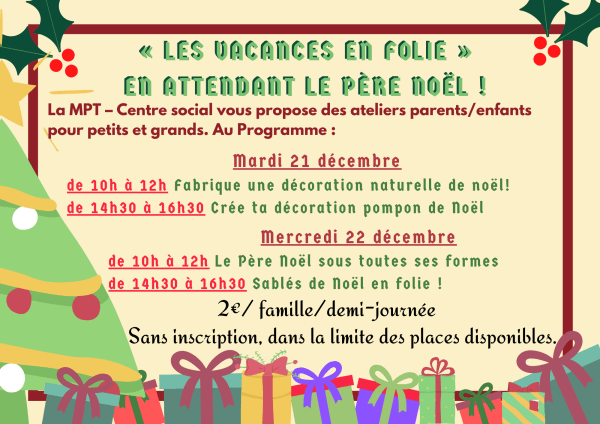 La MPT – Centre social vous propose des ateliers parents/enfants pour petits et grands. Au Programme : Mardi 21 décembre de 10h à 12h : Fabrique une décoration naturelle de noël ! de 14h30 à 16h30 : Crée ta décoration pompon de Noël Mercredi 22 décembre de 10h à 12h : Le Père Noël sous... Lire la Suite →