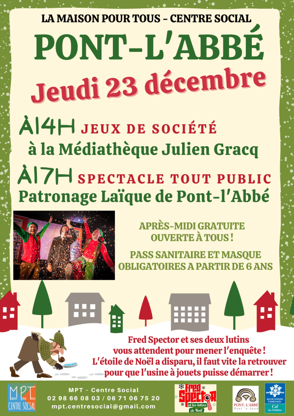 La MPT - Centre Social vous invite jeudi 23 décembre à la médiathèque Julien Gracq de Pont-l'Abbé de 14h à 16h30 pour un moment de jeux en famille. A 17h pour poursuivre cet après-midi, la MPT vous convie à un spectacle à la salle du Patronage Laïque de Pont-l'Abbé. Fred Spector et ses deux lutins, Boule... Lire la Suite →