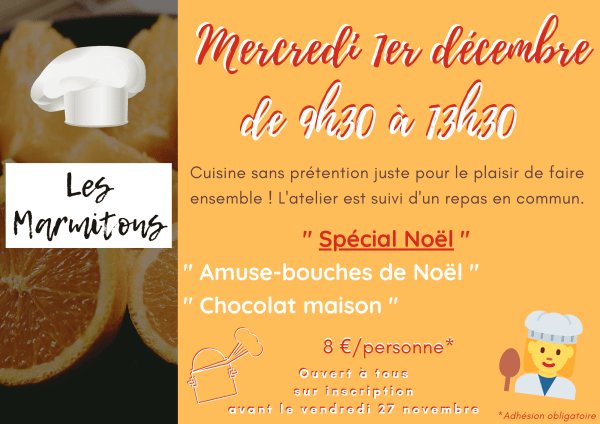 Atelier cuisine " les Marmitons " La Maison Pour Tous vous propose un atelier "Marmitons" spécial Noël. Une cuisine sans prétention juste le plaisir de faire ensemble, découvrir ou redécouvrir des petites recettes simples à reproduire à la maison. L'atelier est suivi d'une dégustation en commun. Mijotons ensemble Amuse-bouches salés et petites douceurs au chocolat... Lire la Suite →