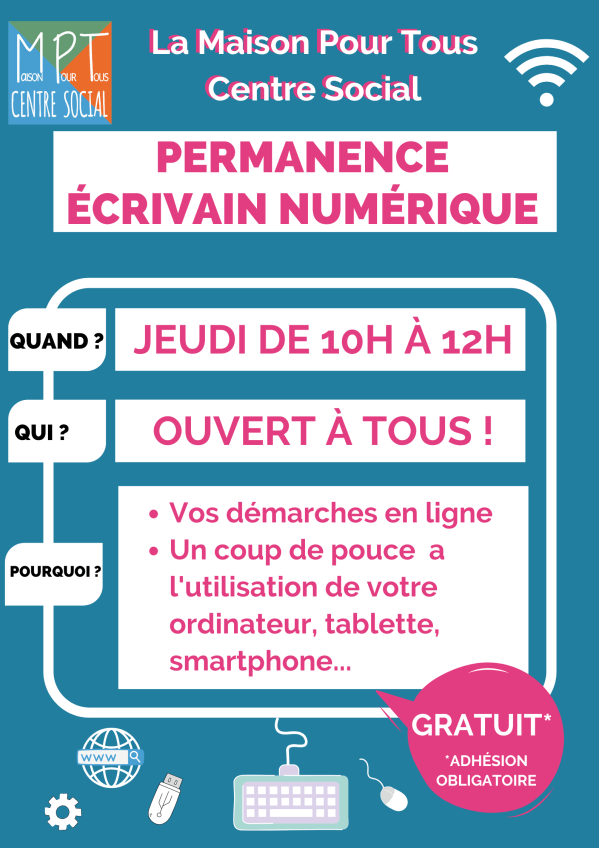A partir du jeudi 18 novembre, reprise des Permanences Écrivain Numérique de 10h à 12h. Sur inscription même de dernière minute au 02 98 66 08 03 au 06 71 06 75 20 ou par e-mail : mpt.centresocial@gmail.com