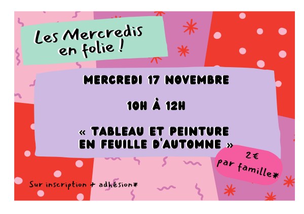 Atelier Parent/Enfant --Mercredi en Folie ! La MPT vous propose un atelier parents/enfants autour d’une activité en famille. Ce mercredi nous vous proposons de confectionner un " tableau et peinture en feuille d'automne ". Infos Pratique : Uniquement sur inscription à l’accueil, par 02 98 66 08 03, au 06 71 06 75 20 ou... Lire la Suite →