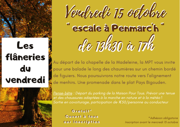 Les flâneries du vendredi : " escale à Penmarc'h " Au départ de la chapelle de la Madeleine, la MPT vous invite pour une balade le long des chaumières sur un chemin bordé de figuiers. Nous poursuivrons notre route vers l'alignement de menhirs. Une promenade dans le plat Pays Bigouden. Infos Pratique : Vendredi 15... Lire la Suite →