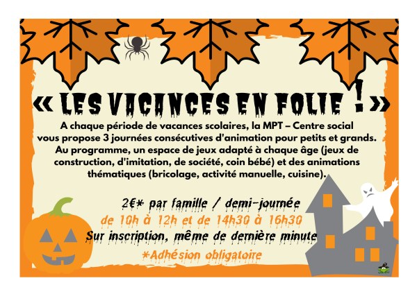 « Les vacances en folie ! même pas peur ! » Mardi 26 octobre de 10h30 à 11h30 : Fabrication de chapeau et de baguette de sorcier ! de 14h30 à 15h30 : Fabrication de lanterne en potiron ! Mercredi 27 octobre de 10h30 à 11h30 : Fabrication de lanterne en potiron ! de 14h30 à 15h30 : Cookies araignée ! Jeudi... Lire la Suite →
