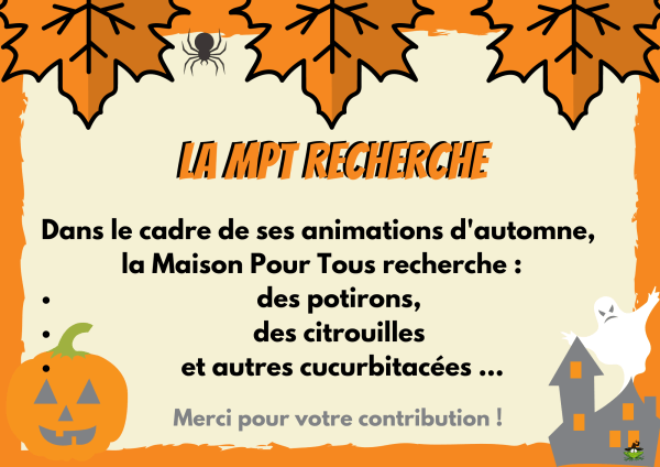 Dans le cadre de ses animations d'automne, la Maison Pour Tous recherche : des potirons,des citrouilleset autres cucurbitacées ... Merci pour votre contribution !