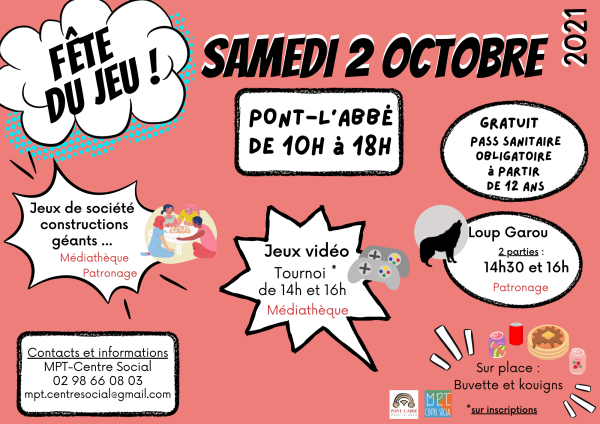 Fête du Jeu La médiathèque Julien Gracq, l'Espace Jeunes de Pont-l'Abbé et la Maison Pour Tous vous propose la Fête du jeu ! Une journée consacré au jeux de société, jeu de plateau, de carte, de stratégie, de mémoire, de rapidité ... de 2 à 102 ans ! 14h à 16h : Tournoi de jeu... Lire la Suite →