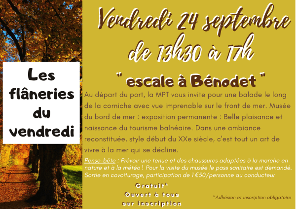 Les flâneries du vendredi : " escale à Bénodet " Au départ du port, la MPT vous invite pour une balade le long de la corniche avec vue imprenable sur le front de mer. Musée du bord de mer : exposition permanente : Belle plaisance et naissance du tourisme balnéaire. Dans une ambiance reconstituée, style... Lire la Suite →