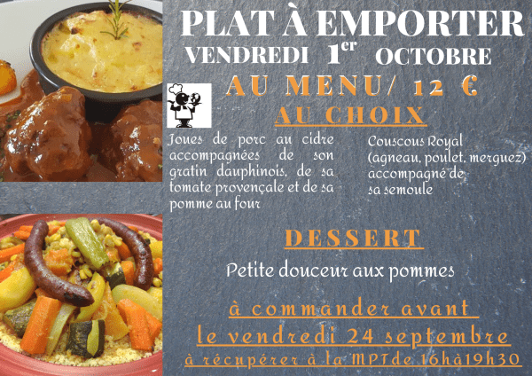 Plat à emporter La Maison Pour Tous vous propose une vente de plat à emporter ! Choix 1 : Joues de porc au cidre accompagnées de son gratin dauphinois, de sa tomate provençale et de sa pomme au four. En dessert petite douceur aux pommes. Choix 2 : Couscous Royal (agneau, poulet, merguez) accompagné de... Lire la Suite →