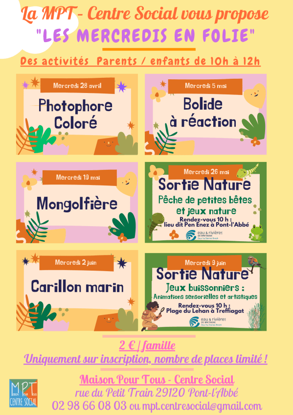 La MPT – Centre Social vous propose des activités Parents/Enfants La MPT – Centre Social vous propose des activités manuelles Parents/Enfants les mercredis de 10h à 12h. Uniquement sur inscription au 02 98 66 08 03 ou par courriel mpt.centresocial@gmail.com Le port du masque de catégorie 1 est obligatoire à partir de 6 ans. Ces... Lire la Suite →